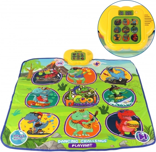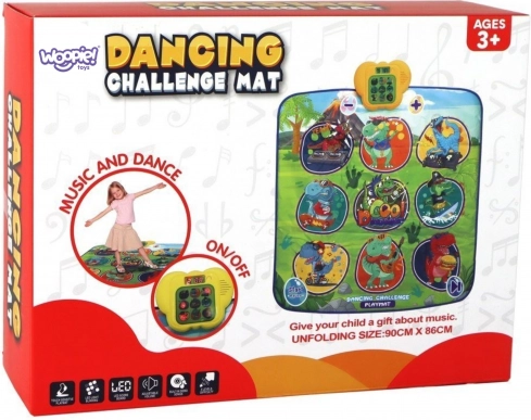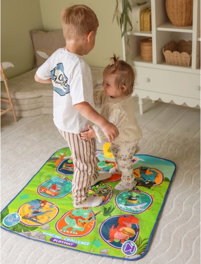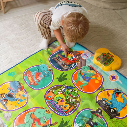 Vesela plesna podloga z dinozavri spodbuja otroke k gibanju in interaktivnemu učenju. Devet velikih, barvitih polj reagira na dotik, vodenje korakov pa zagotavlja kontrolni modul, ki na zabaven način podpira koordinacijske sposobnosti, občutek za ritem in slušno zaznavanje. Mehka zasnova je prijetna pri stopanju in varna za vsakodnevno igro.