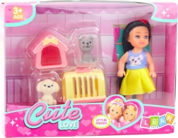 Mini punčka s kužki in dodatki je odličen igralni set, ki ga bo vzljubil vsak otrok, ki ima rad živali. Komplet vsebuje 12 cm visoko punčko, oblečeno v pisano oblekico s potiskom prisrčnega kužka, ter dva kužka – eden ima svojo barvito utico, drugi pa potuje v rumeno-rožnatem transporterju. Ta komplet otroku ponuja veliko možnosti za ustvarjanje zgodb in situacij iz življenja male lastnice kužkov.