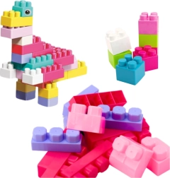 Gradbeni komplet vsebuje razlicne oblike in velikosti, ki omogočajo ustvarjanje živali, vozil ali črk, kar spodbuja razvoj ročnih spretnosti, domišljije in učenje skozi igro. Raznoliki in razgibani elementi omogočajo gradnjo tako preprostih kot kompleksnejših konstrukcij, kar spodbuja prostorsko razmišljanje, kreativnost in logično načrtovanje.
