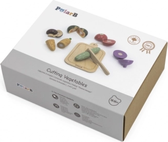 Lesena garnitura za rezanje zelenjave za otroke. Vsebuje desko, nož in šest vrst zelenjave. Starost 18 mesecev+.