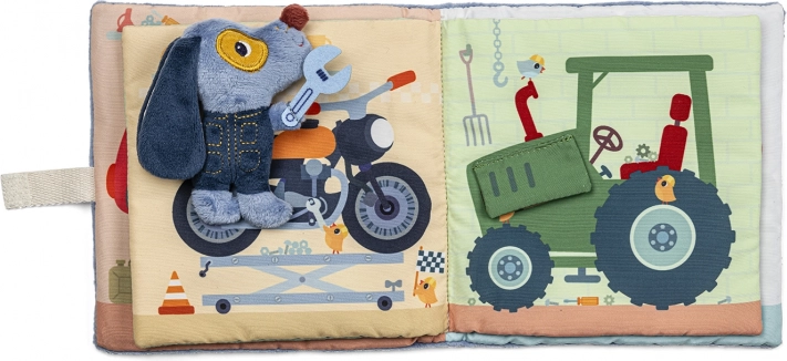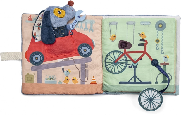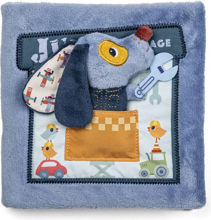 Interaktivna tekstilna knjižica Kužek Jules v garaži za otroke od 12 mesecev. Spodbuja motoriko in domišljijo.