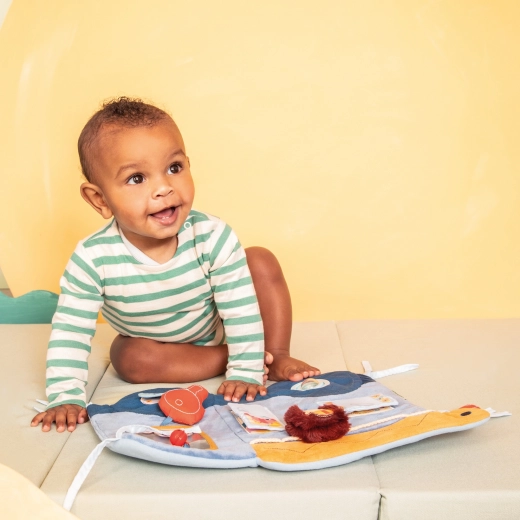 Spoznajte tekstilno tablo za posteljico, ki bo oživila sobico vaših malčkov. Oblikovana je v obliki tovornjaka kužka Julesa in njegovih prijateljev ter ponuja pester izbor vizualnih, tipnih in zvočnih elementov. Ploščo je mogoče preprosto obesiti na posteljice ali ograjice s pomočjo posebnih zank.