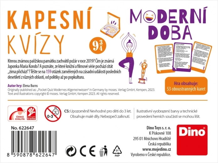 Odkrijte zabavno in pametno igro za vso družino: žepne kvize, ki preverijo vaše znanje sodobnosti. Čaka vas 159 vprašanj na teme šport, film, kultura, politika, tehnologija in narava na 53 dvostranskih kartah z besedili v češčini. Idealno na pot, za hitro igranje in zanimiva dejstva, ki vas bodo presenetila.