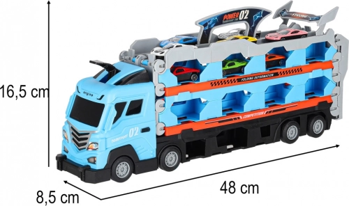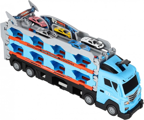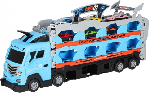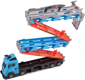 Ta multifunkcijski komplet združuje prevoznik avtomobilov in dolgo dirkalno stezo v enem. Po razložitvi se tovornjak spremeni v dvojno stezo dolžine 210 cm, na kateri lahko otroci pripravljajo napete dvoboje in merijo rekorde.