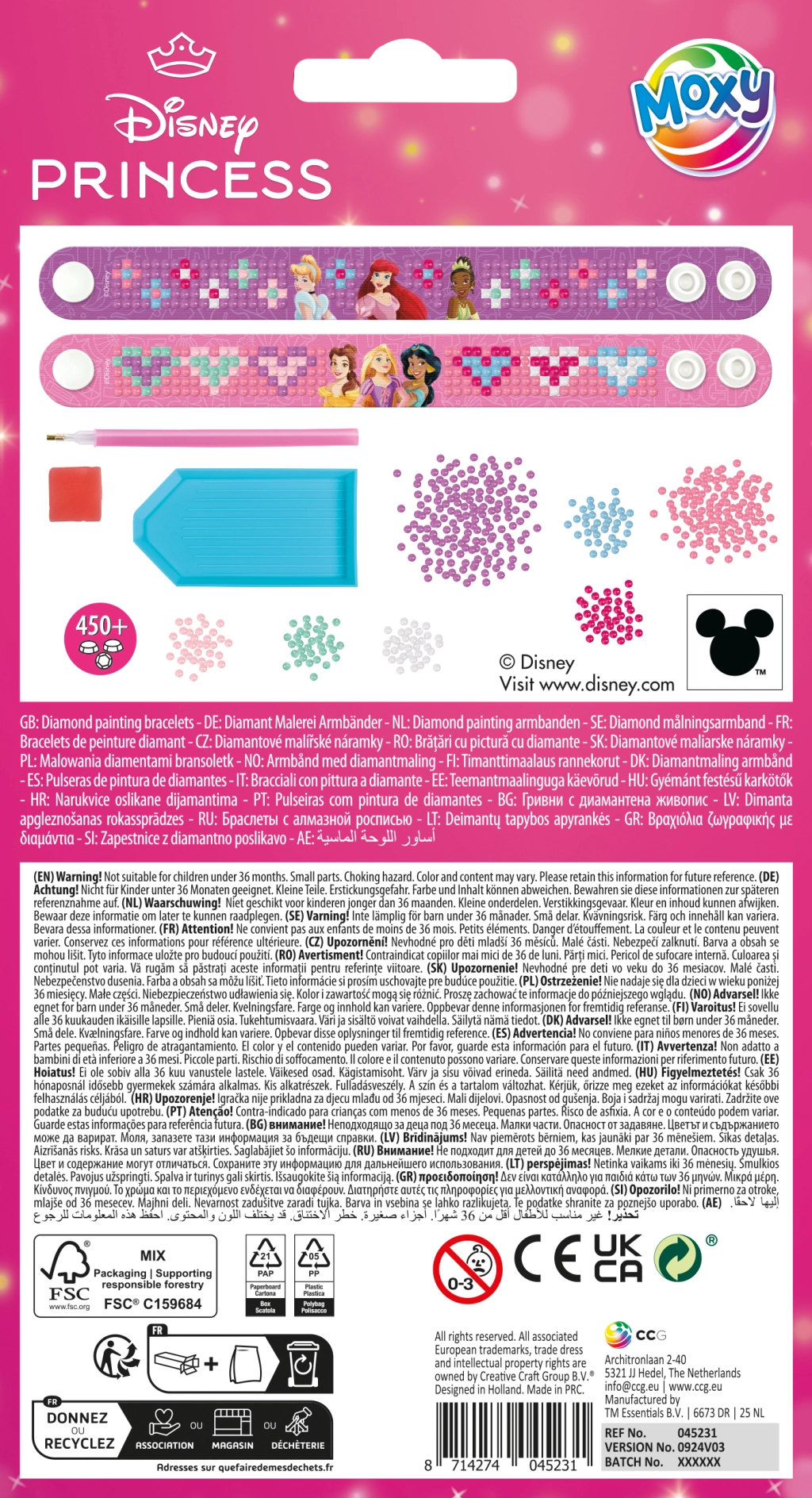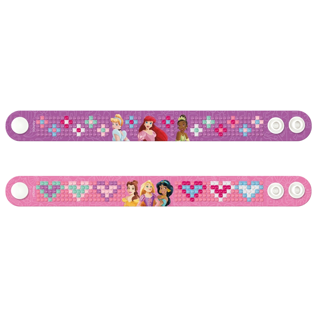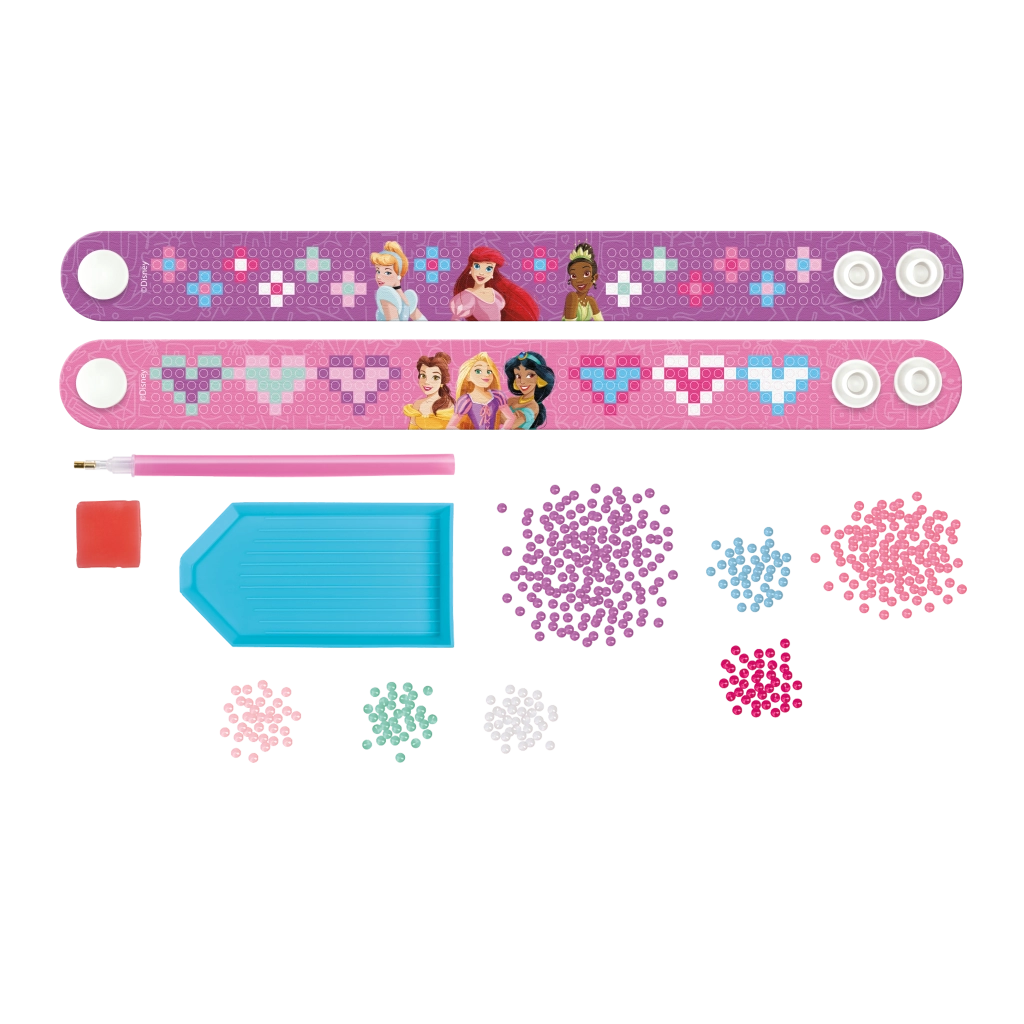 Ustvarite si svoje lastne bleščeče zapestnice z motivom Disney Princesk s pomočjo diamantnega slikanja! Ta ustvarjalni komplet vsebuje vse, kar potrebujete za okrasitev dveh izvirnih zapestnic z bleščečimi kamenčki.