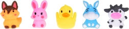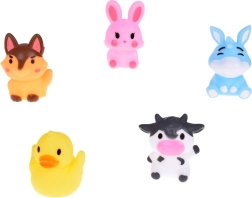 Komplet vsebuje: 5 gumijastih figuric živali s kmetije, vsaka v drugi barvi (zajec, krava, pes, raca, osel) z merami približno 5 cm x 4 cm x 4 cm. Igrača je izdelana iz varnih, gumijastih materialov, ki so prijazni občutljivi otroški koži. Enostavno vzdrževanje in zelo trpežno, kar zagotavlja dolgo trajanje.