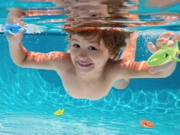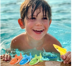 - Potapljanje za morskimi psi: Morske pse razporedite po bazenu ali otroškem plitvaku. Ko se potopijo na dno, je otrokova naloga, da jih ulovi, s čimer se nauči potopiti in nadzirati dih.