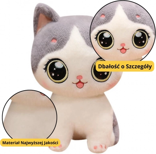 Plišasta mucka je izdelana iz visokokakovostnega sivo-belega pliša, ima velike, sijoče oči in majhen smrček. Zaobljena oblika, rožnati detajli in skrbna izdelava jo naredijo izjemno prikupno in prijazno.
