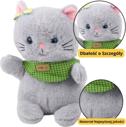 Ta plišasta mucka je odličen spremljevalec za otroke zaradi svoje mehkobe in ljubkosti. Izdelana je iz nežnega sivega pliša, ki je varen za otroke in prijeten na dotik. Glavni okras vključuje zeleni šal in rumeno pentljico, kar ji daje edinstven šarm.