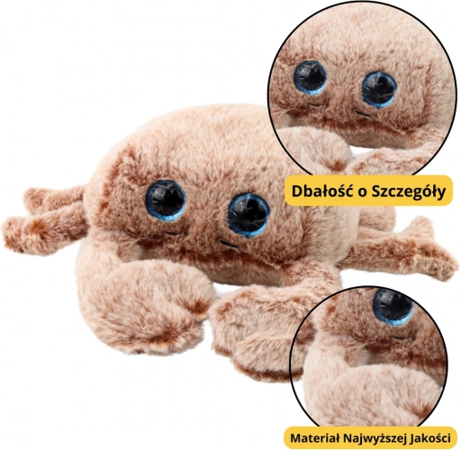 Ta plišasti rak je popoln prijatelj za vse ljubitelje morskih bitij. Narejen je iz mehkega bež pliša, ki je prijazen na pogled in udoben na dotik. Lep zaobljen oblikovni slog, velike sijoče oči ter realistično izdelane klešče in nožice mu dajejo privlačen videz.
