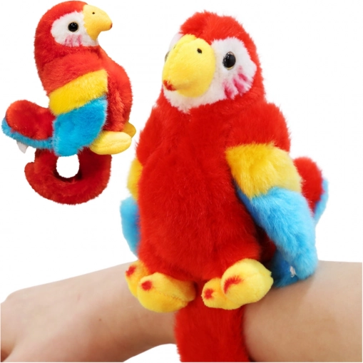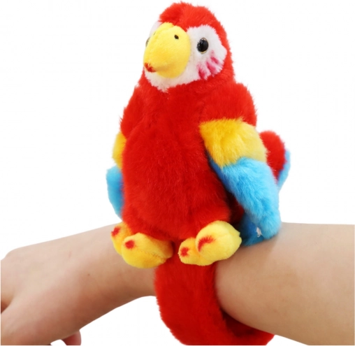 Barvit in mehak plišasti papagaj na zapestnici za otroke: prisrčna in praktična igrača za na pot, ki jo je enostavno nositi.