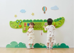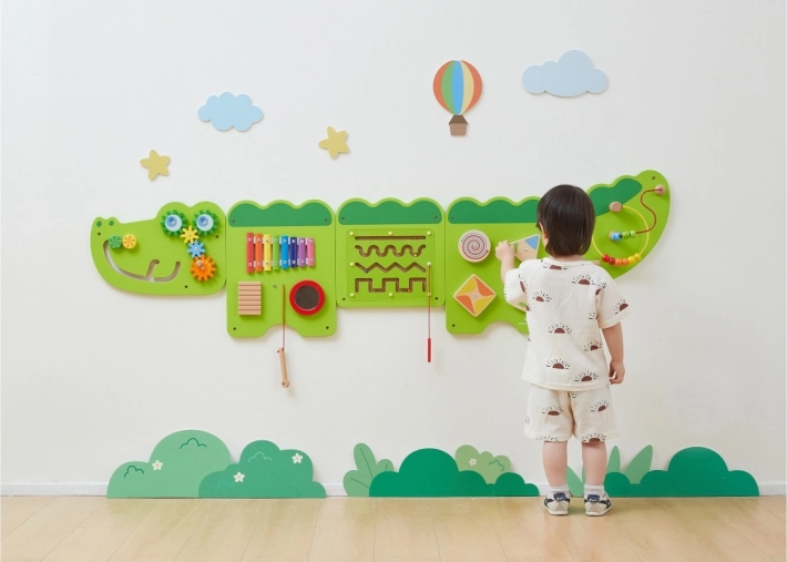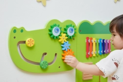 Zabavna lesena stenska tabla v obliki krokodila otrokom od 18 mesecev prinaša ure čutnega raziskovanja in vaje fine motorike. Ponuja ksilofon, zobata kolesca, labirint, drsne in vrtljive elemente ter kroglice na žici, ki razvijajo koordinacijo oko–roka, logično mišljenje in glasbeno dojemanje. Zaradi stenske montaže prihrani prostor in je idealna za otroške sobe, vrtce in igralne kotičke.