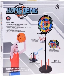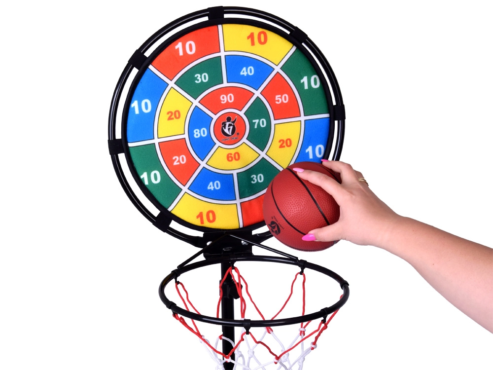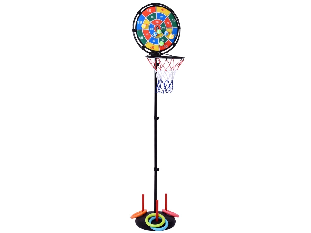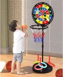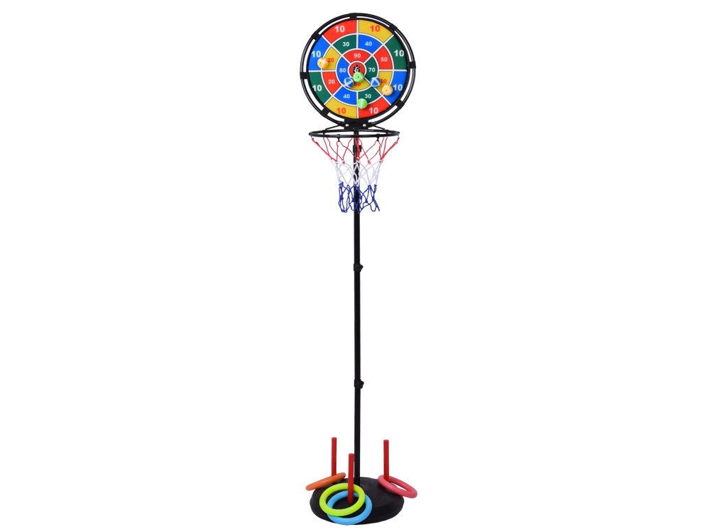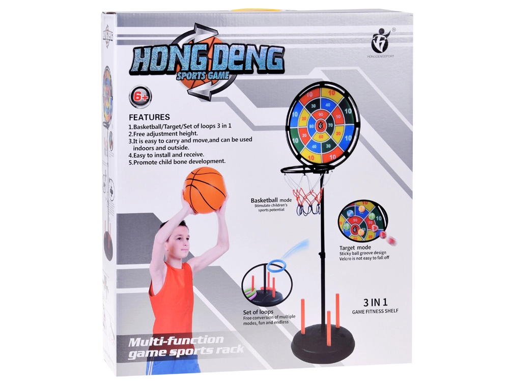 Zabaven športni komplet 3v1, ki združuje zabavo s telesno aktivnostjo za otroke in vso družino. Omogoča igranje košarke, metanja na tarčo in metanja obročev – idealno za uporabo v zaprtih prostorih in na prostem.