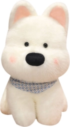 Plišasti kužek se ponaša z nežno belo dlako in črnimi očmi, ki mu dajejo posebej ljubek videz. Celoten dizajn dopolnjuje okrasna ruta v modrih tonih, ki poudarja njegov prijazen značaj.