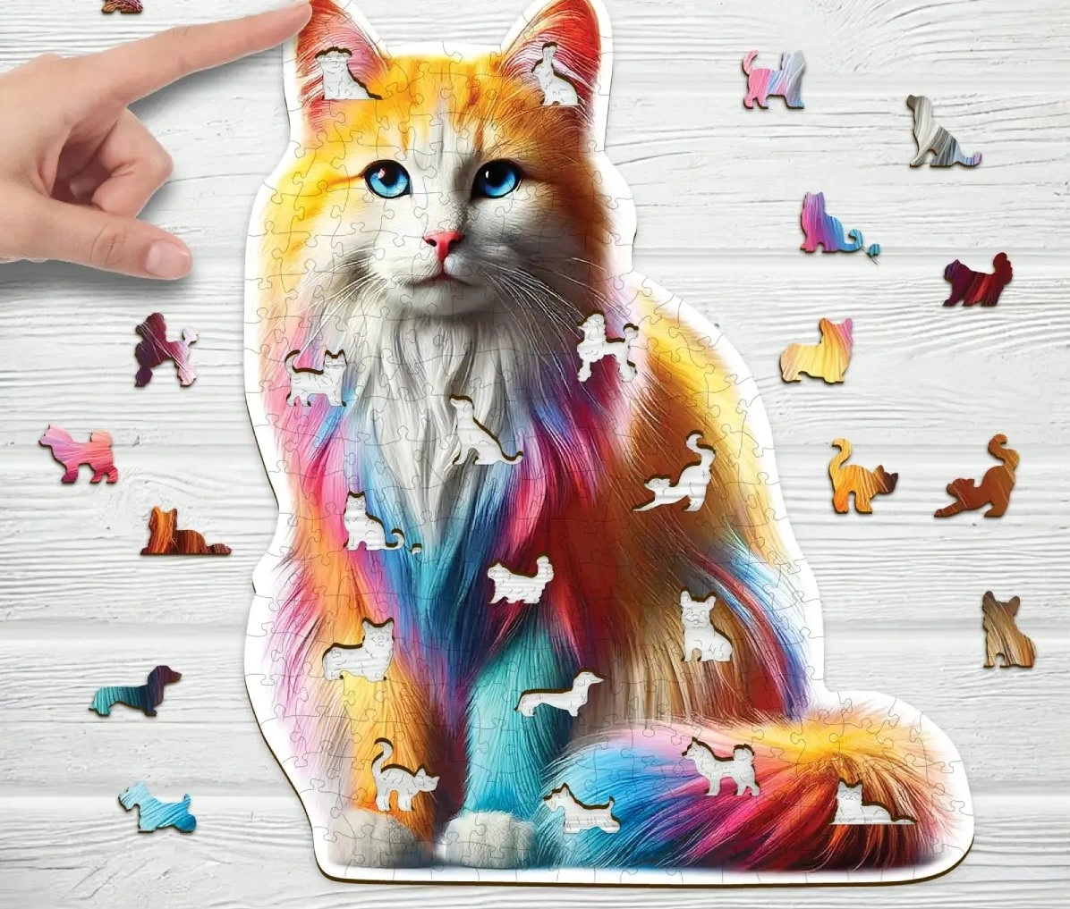WOODEN CITY lesene sestavljanke Mavrična mačka so odlična zabava za vsakega ljubitelja sestavljank. Posebno oblikovani koščki in okolju prijazna embalaža zagotavljajo izjemno izkušnjo pri sestavljanju.