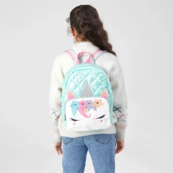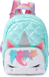 Model je izdelan iz trpežnega, a hkrati lahkega materiala, ki dobro prenaša vsakodnevno uporabo. Na sprednji strani je mehka aplikacija z motivom samoroga, vključno z izrazitimi ušesi in rogom, kar mu dodaja edinstvenost. Nahrbtnik vsebuje glavni prostorni predal, en manjši notranji žep in dodatni zunanji žep na zadrgo.