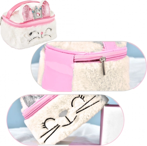 Ta kozmetična torbica je izdelana iz kakovostnega mehkega pliša v kombinaciji z sijajnim sintetičnim materialom. Glavni predal z zadrgo omogoča enostaven dostop in varno shranjevanje vsebine. Torbica je opremljena s praktičnim ročajem za prenašanje, je lahka, priročna in estetsko prijetna – idealna tako za vsakodnevno uporabo kot za potovanja.