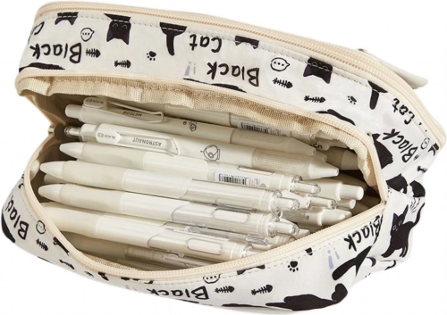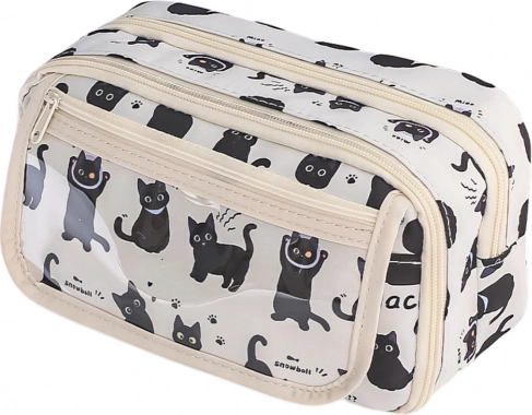 Peresnik z zabavnim motivom črnih mačk ima glavni prostorni predal in dodatne notranje razdelke, ki omogočajo urejeno shranjevanje vseh šolskih pripomočkov.