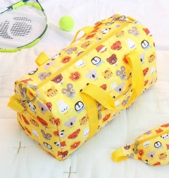 Prostorna in praktična otroška potovalna torba z veselimi živalskimi potiski. Idealna za šport ali izlete, z možnostjo nošenja v roki ali čez ramo.