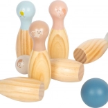 - 6 lesenih kegljev in 2 krogli – idealno za majhne otroške roke