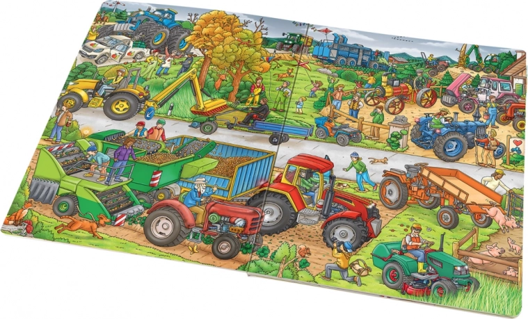 Odkrijte svet traktorjev in kmetijskih strojev, ki imajo v vsakem letnem času polne roke dela. Ta velikoformatna knjiga, polna podrobnih ilustracij, vas popelje po polju, kmetiji in vasi, kjer jih ljudje nenehno uporabljajo.