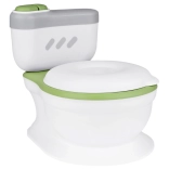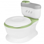 Interaktivni otroški kahlic v obliki pravega stranišča olajša navajanje na toaleto z realističnim zvokom splakovanja in veselimi melodijami. Ima mehko oblazinjeno sedalo, odstranljiv vsebnik za enostavno čiščenje in priročen dozirnik za vlažilne robčke. Stabilna zasnova, udobno sedenje in gumb, ki posnema splakovanje, spremenijo kahlic v igrivo in motivacijsko pripomoček za vsakodnevni trening.