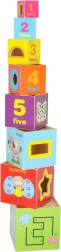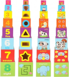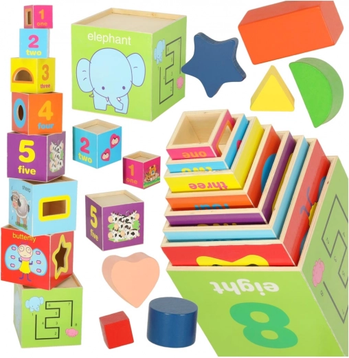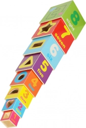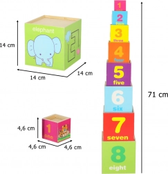 Ta set vsebuje 8 barvitih lesenih kock, ki jih je mogoče zlagati eno na drugo in ustvariti stolp visok do 71 cm! Vsaka kocka ima 8 aktivnih izobraževalnih strani, ki ponujajo različne možnosti igre in učenja.