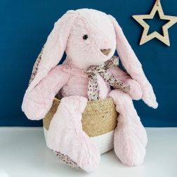 Ta velik plišasti zajček v nežnem rožnatem odtenku navduši z mehkobo in prikupnim videzom. Spodbuja čute in radovednost otrok, daje občutek varnosti ter postane priljubljen spremljevalec pri uspavanju in igri.