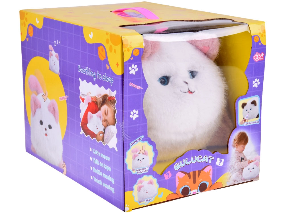 Spoznajte mačko Pusia, interaktivno igračo, ki je kot vaš pravi ljubljenček. Ta mehka bela mačka z rožnatimi tačkami in repom ima učinkovite zvočne in gibalne funkcije. Ko jo pobožate po hrbtu, se aktivirajo zvoki mijavkanja in predenja – dopolnjeni z gibi repa in mežikanjem oči, kar ustvarja realistične občutke.