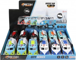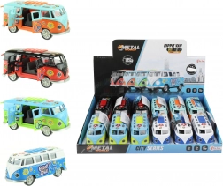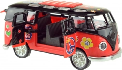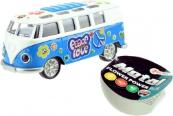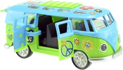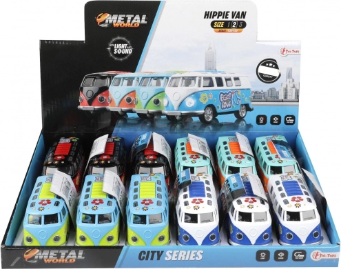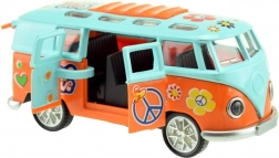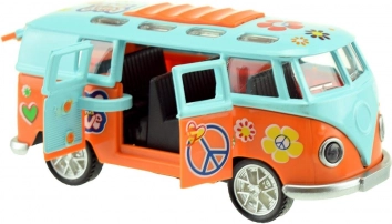Odkrijte mini retro avtobus, ki takoj pritegne pozornost s pisanim »hipijevskim« slogom in ob zagonu preseneti z efekti. Dovolj je, da ga potegnete nazaj in spustite – vztrajnik poskrbi za živahno vožnjo, medtem ko svetloba in zvok motorja poudarita doživetje.