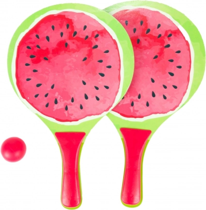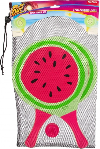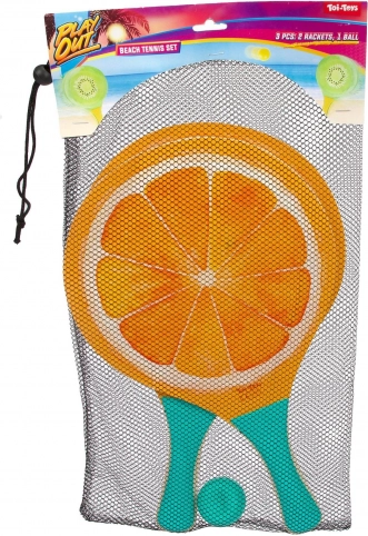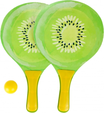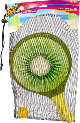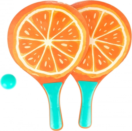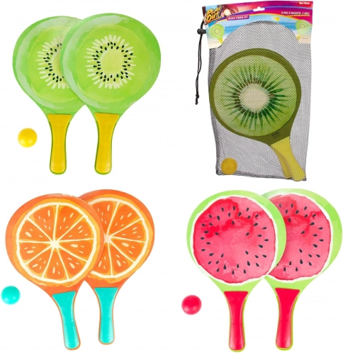Uživajte poletje na polno s stilskim kompletom za plažni tenis z motivi sadja. Vsebuje 2 lahka loparja in 1 žogico v praktični mrežasti vrečki za prenašanje. Barvni potiski kivija, lubenice ali pomaranče vabijo k igri na plaži, na vrtu ali v parku. Odlično za družinsko zabavo, razvoj koordinacije in gibanja na svežem zraku.