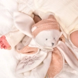 Ta plišasti medvedek je izdelan iz mehke roza keper tkanine in okrašen z nežnim vezenjem. Veliki cvetni listi na telesu pomagajo razvijati otrokovo fino motoriko in hkrati nudijo občutek udobja in varnosti.
