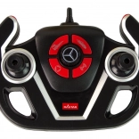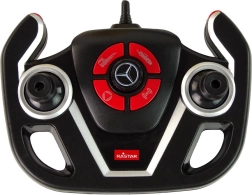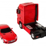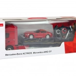 Vozilo meri 64 cm x 16 cm x 10 cm, kar omogoča prevoz drugih igrač. Rdeči avtomobilček Mercedes, del seta, je v celoti upravljan z daljinskim upravljanjem in meri 18 cm x 5 cm x 8 cm – idealno za otroške roke. Vsi deli, vključno z upravljalnikom dimenzij 13 cm x 6 cm x 10 cm, so izdelani iz trpežne plastike, kar zagotavlja dolgotrajno zabavo.