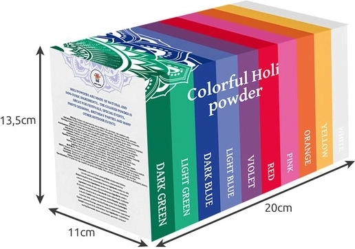 Set barvnih holi prahov prinaša barvni spektakel za vsak dogodek – od rojstnih dni in timbildingov do festivalov in množičnih prireditev. Fin prah se lepo razprši po zraku in ustvari izrazite barvne oblake, ki izstopajo v živo in na fotografijah.
