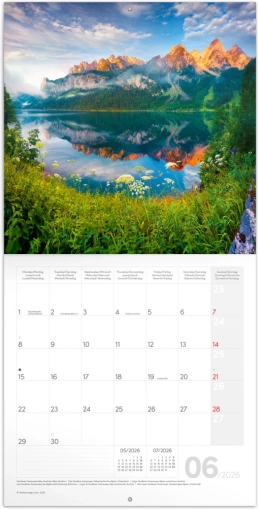 Koledar vsebuje 12 visokokakovostnih fotografij, ki prikazujejo lepote Alp ter prinašajo mirno in navdihujoče vzdušje v vaš dom ali pisarno.