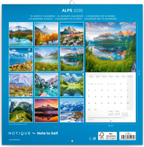 Doživite čar najvišjih evropskih gora s tem beležniškim koledarjem za leto 2026, ki prinaša 12 osupljivih fotografij Alp v vrhunski tiskovni kakovosti.