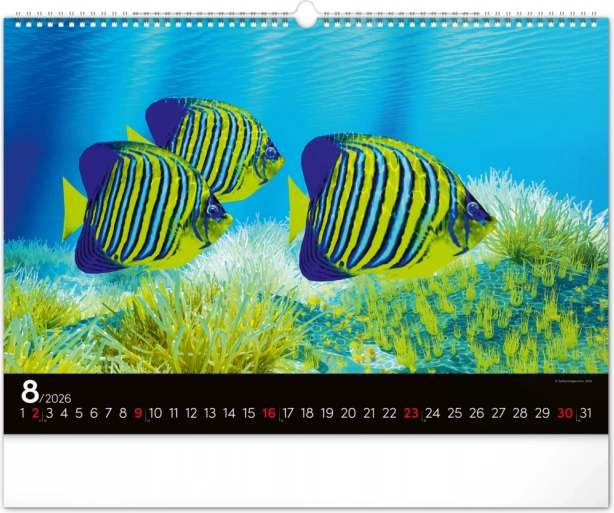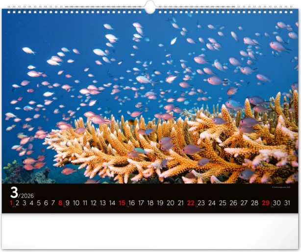 Marcova stran koledarja vas napolni z energijo s prizorom, polnim majhnih ribic med koralnimi grebeni. Modro oceansko ozadje doda sliki dinamiko in svežino.