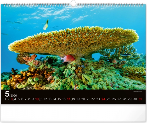 Maj prinaša podobo koralnega raja z pisano paleto rib, ki koledarju dodajo jasne in žive barve. Ta mesec žari v optimizmu in lepoti.