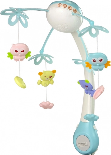 Vrtiljak za posteljico je opremljen z barvnimi zvezdicami in visečimi igračkami v obliki ptičkov in medvedkov, ki spodbujajo otroka k stezanju rok in prijemanju visečih predmetov. Tako pomagajo razvijati čute in krepiti mišice. Stranski deli so iz mehke, netoksične gume, ki lahko služijo kot grizalo.
