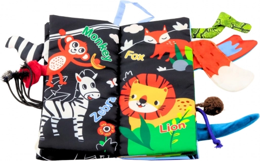 Šumeče strani in izbočeni repki živali z različnimi teksturami in barvami spodbujajo otrokove čute, razvijajo njegovo radovednost in ročne spretnosti. Barvite ilustracije živali, kot sta zebra in žirafa, spodbujajo učenje in igro. Knjiga je lahka in enostavna za prenašanje, idealna za potovanja ali sprehode.