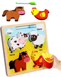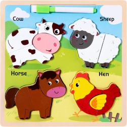 Ta lesena izobraževalna sestavljanka vsebuje živali, kot so krava, ovca, konj in kura, ki so otrokom dobro znane. Vsaka žival je sestavljena iz več delov, ki jih je treba pravilno umestiti, kar spodbuja razvoj gibalne koordinacije in logičnega razmišljanja.