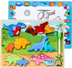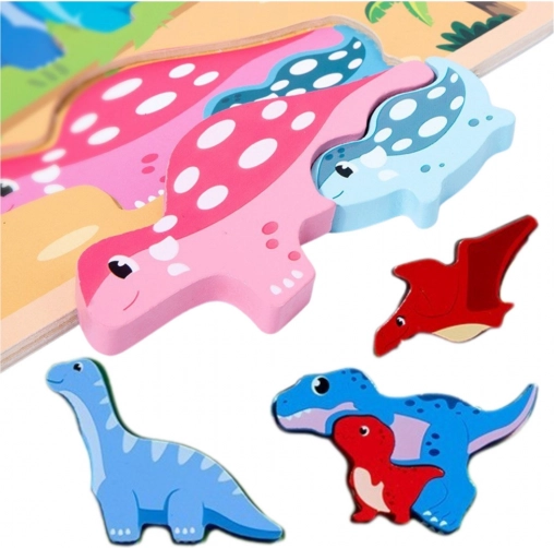 Ta lesena izobraževalna sestavljanka vsebuje 12 barvitih dinozavrov, ki jih otrok umešča na prava mesta, kar pomaga pri razvoju logičnega razmišljanja in koncentracije. Poleg tega razvija ročne spretnosti in domišljijo.