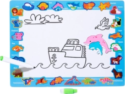 Na zadnji strani plošče je suho brisljiva tabla z merami 30 x 22,5 cm, na kateri lahko otrok ustvarja lastne risbe s priloženim flomastrom. To je odličen način za razvijanje domišljije in vadbo fine motorike.