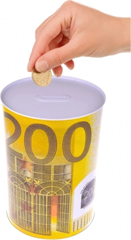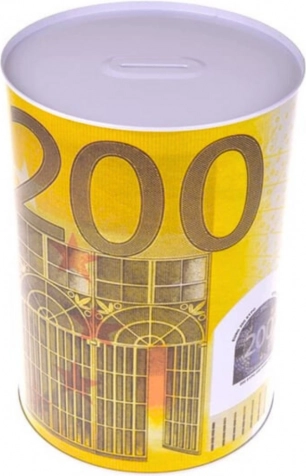 Kovinska hranilnika v obliki pločevinke z motivom bankovca 200 evrov