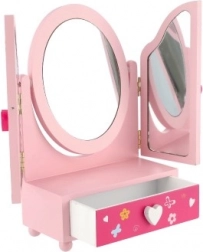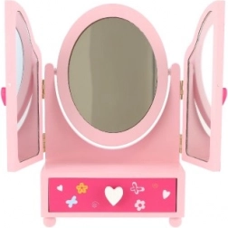 Izdelek je izdelan iz kakovostnega lesa in ima stabilno konstrukcijo. Približna dimenzija odprtega ogledala je 33 cm; embalaža meri približno 18 × 26 × 10 cm. Primerno za otroke od 3 let.