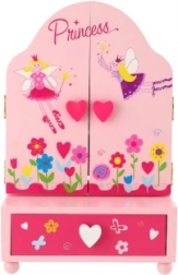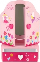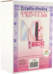 Lesena toaletka s škatlico za nakit Princess je odličen dodatek za otroško sobo. Sredinsko ovalno ogledalo dopolnjujeta dve stranski krili za udobno nastavitev kota. V spodnjem delu najdete praktičen predal, kamor si otroci pospravijo svoje male zaklade. Nežno okrasje z motivi vil, cvetlic in srčkov spodbuja domišljijo in veselje do igre.