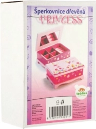 Ta rožnata lesena škatlica za nakit Princess združuje čaroben videz s praktično razdelitvijo. Zahvaljujoč zrcalcu na notranji strani pokrova in petim premišljeno zasnovanim predalčkom pomaga ohranjati nakit in drobnarije lepo urejene. Nežna cvetlična dekoracija in napis Princess ustvarjata pravljično vzdušje, ki se odlično poda v otroško sobo.