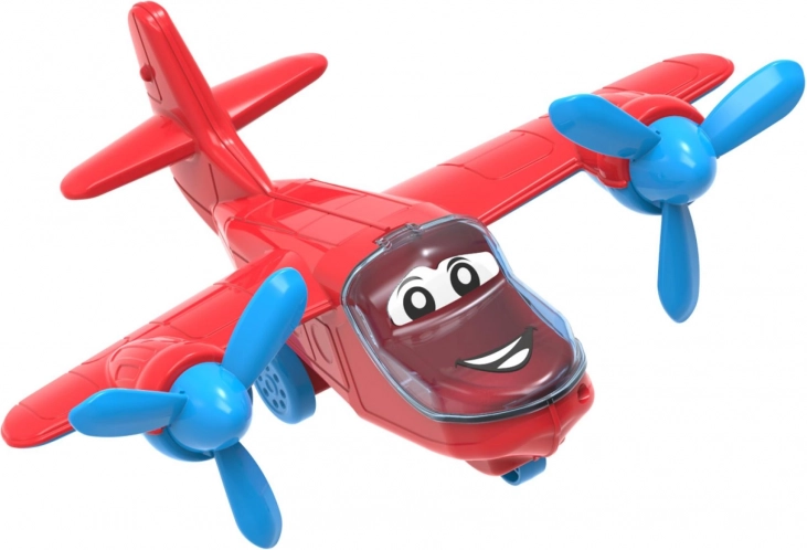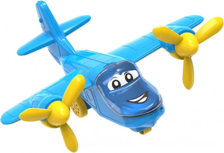 Igrivo plastično letalo s prijaznim obrazom je vedno pripravljeno na vzlet – njegova prosta vožnja omogoča gladko premikanje po tleh brez baterij. Odpirljiva kabina otrokom omogoča pogled v notranjost ali namestitev lastnih mini figuric, kar spodbuja ustvarjalne zgodbe in igro vlog.