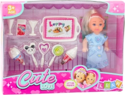 Komplet vsebuje 12 cm visoko punčko, oblečeno v modro obleko z ljubkimi potiski, ter tematske dodatke, kot so lizike, sladoledi, korneti in pladenj s prigrizki. Ti dodatki ne le popestrijo igro, temveč tudi spodbujajo razvoj domišljije, ročnih spretnosti in družabnih veščin otroka.