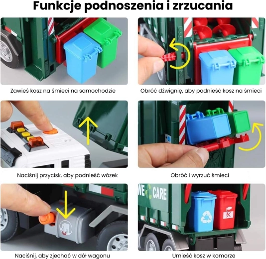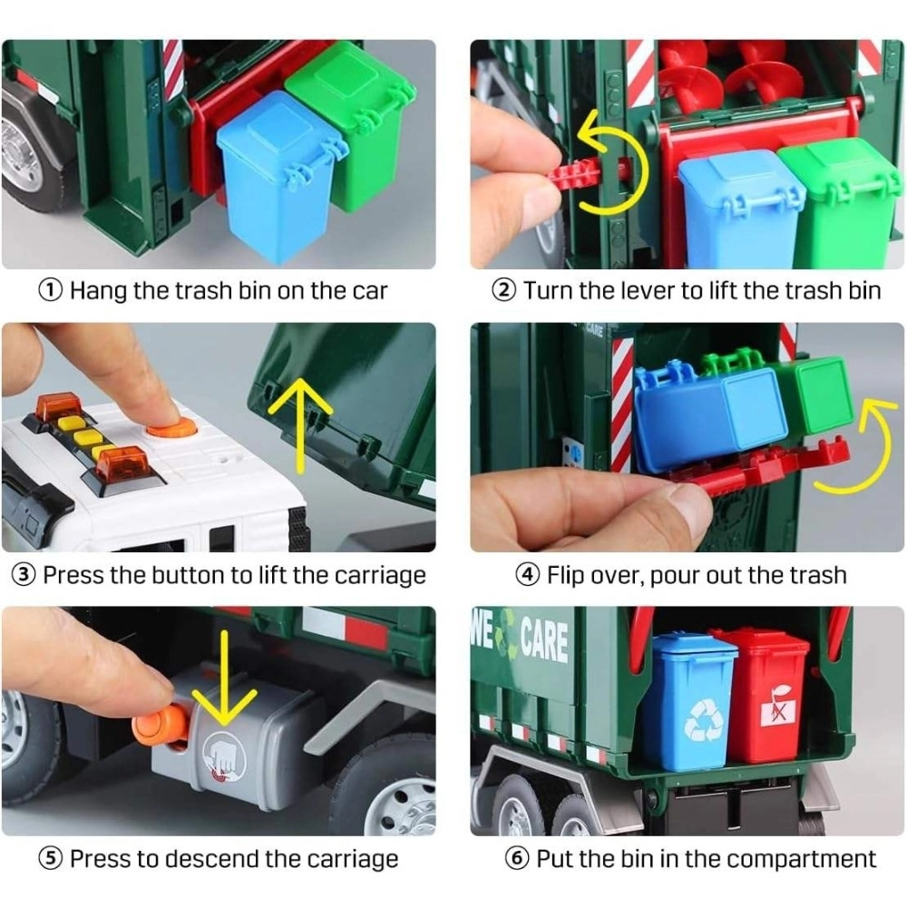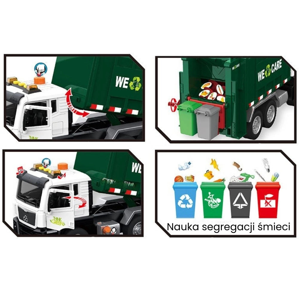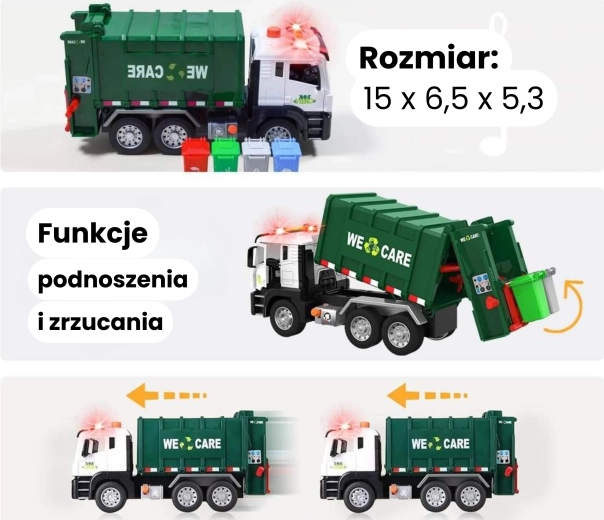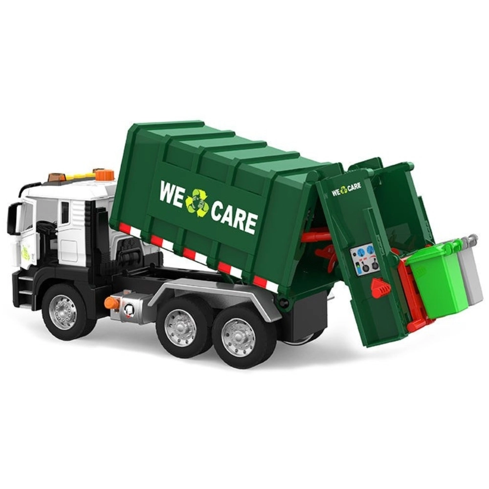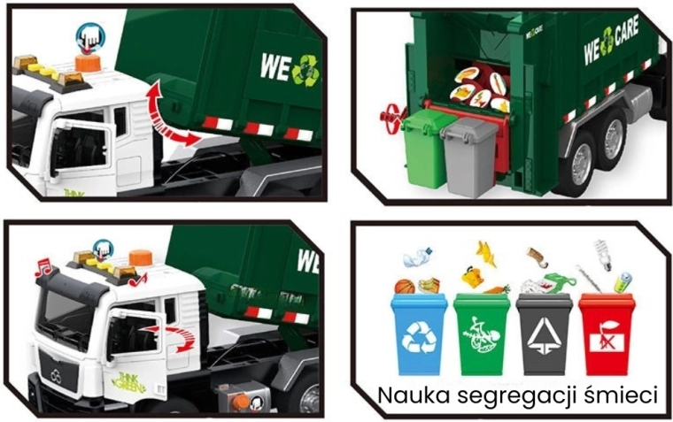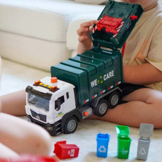 Ta podrobno izdelan smetarski tovornjak z napisom »WE CARE« otrokom ponuja pristno igro odvoza odpadkov. Zahvaljujoč funkcionalni dvižni roki, odpirajočim se zadnjim vratom in priloženim mini košem si otroci preizkusijo resnične postopke ločevanja in odvažanja odpadkov. Vgrajeni svetlobni in zvočni učinki povečujejo zabavnost in spodbujajo domišljijo.